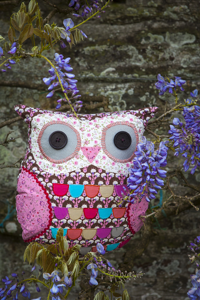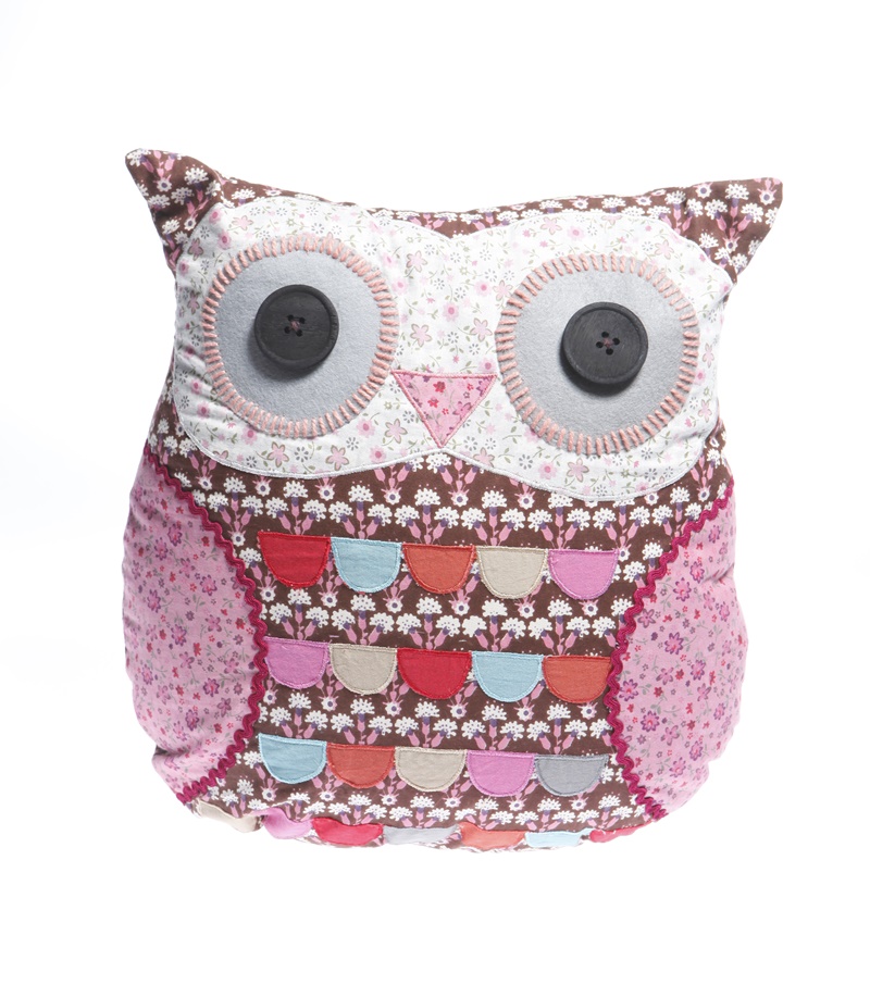 Wyjątkowa, wykonana z oryginalnych i pięknych materiałów, wykończona kolorowymi nićmi, tasiemkami i guzikami poduszka w kształcie Sowy.