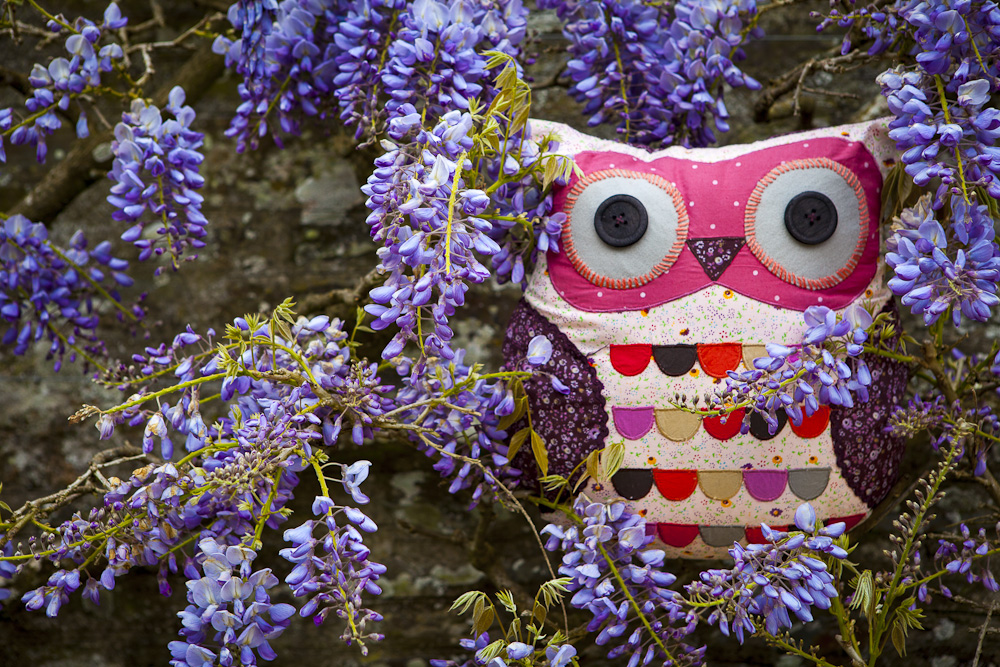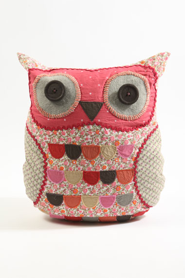 Wyjątkowa, wykonana z oryginalnych i pięknych materiałów, wykończona kolorowymi nićmi, tasiemkami i guzikami poduszka w kształcie Sowy.