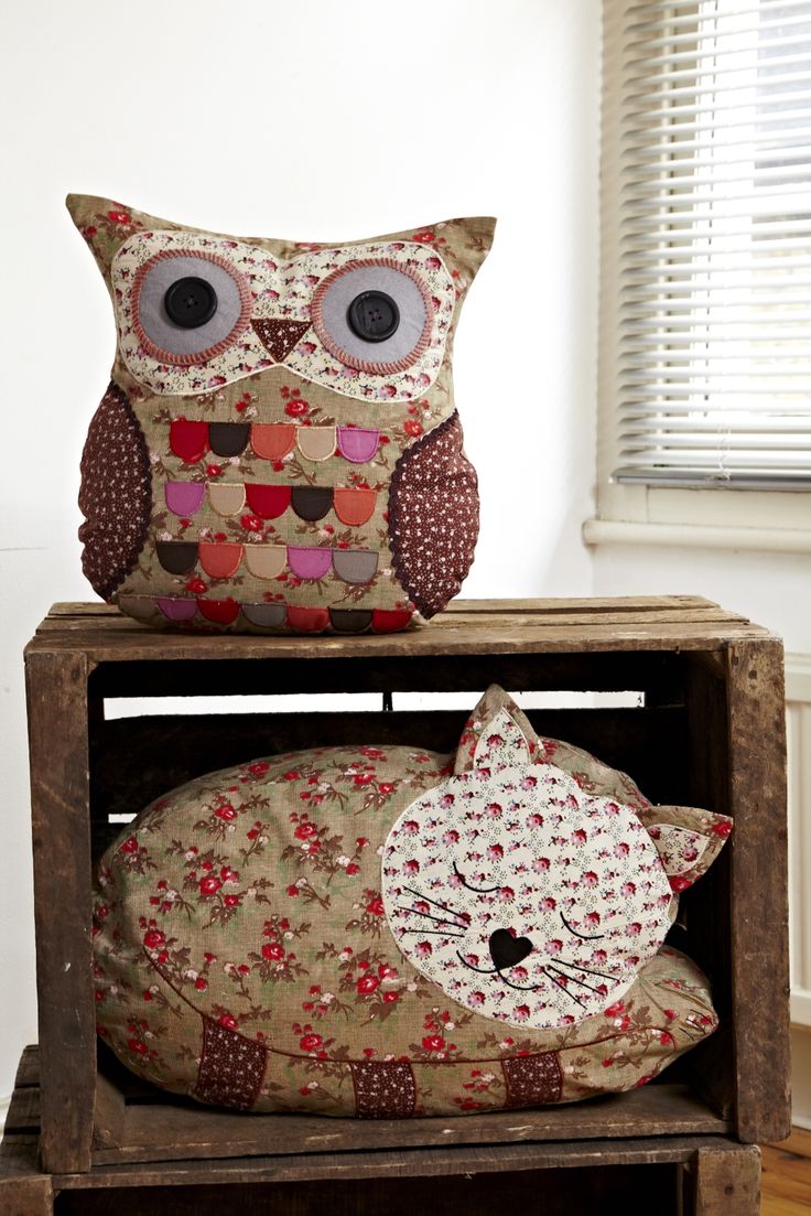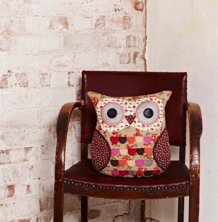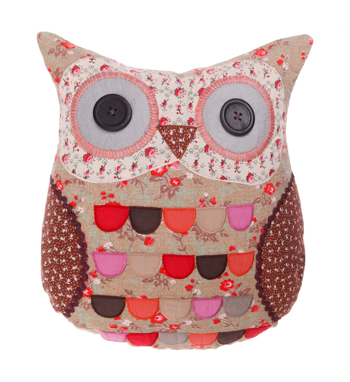 Wyjątkowa, wykonana z oryginalnych i pięknych materiałów, wykończona kolorowymi nićmi, tasiemkami i guzikami poduszka w kształcie Sowy.